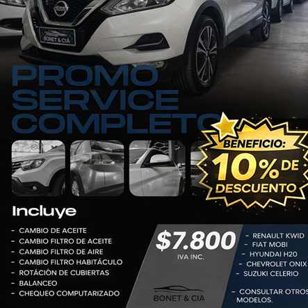 El service incluye cambio de aceite, filtros, rotación de cubiertas, balanceo y chequeo computarizado, asegurando el correcto funcionamiento y prolongando la vida útil de tu auto.