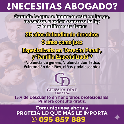 La Dra. Giovanna Díaz es abogada con sólida trayectoria en derecho penal y derecho de familia, destacándose por su experiencia como ex jueza y más de 25 años defendiendo derechos.